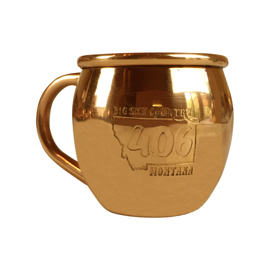 16oz Smooth 100% Copper Mug with 406 logo in colored cardboad box.